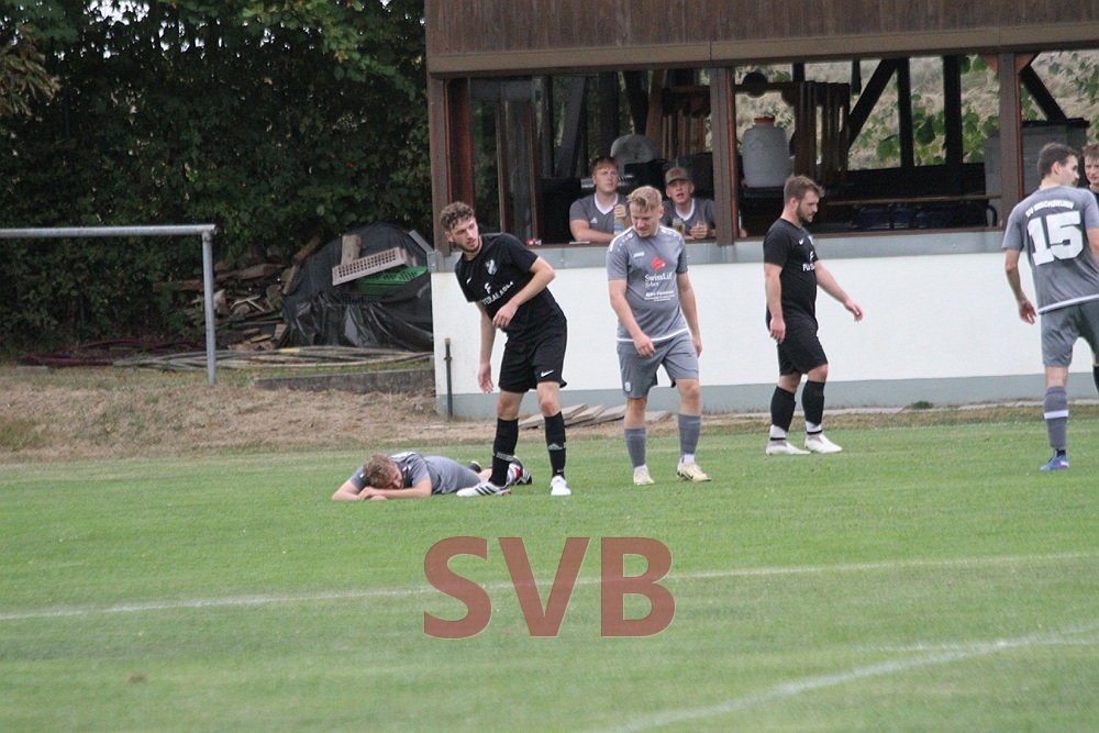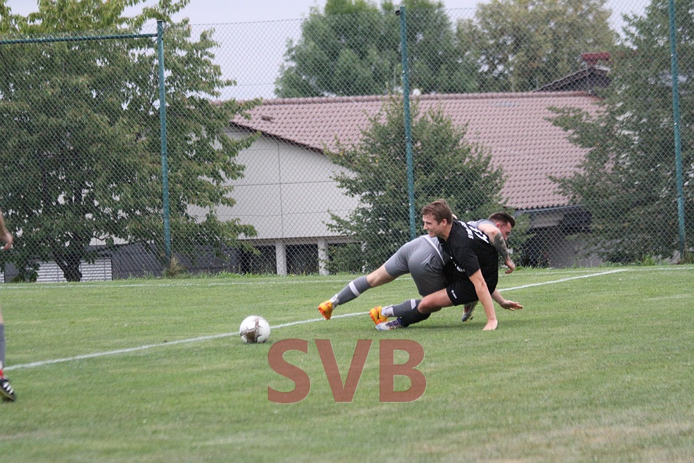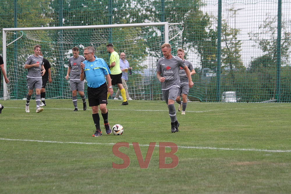 Dies setzte offenbar neue Kräfte bei der SG frei und nur kurz darauf sorgte Julian Roth mit einem Sprint über den halben Platz für ein Raunen unter den knapp 130 Zuschauern, verpasste aber dann ein Abspiel auf Lars oder Steffen Schwab und blieb in zwei Verteidigern hängen. Drei Minuten später durfte die SG aber doch noch jubeln: Erneut stand Markus Weyer zum Freistoß bereit, brachte diesen halbhoch an der Mauer vorbei zu Domi Weisner, der den Ball wie ein echter Torjäger mit dem Rücken zum Tor annahm, sich drehte und den Torwart zur SG-Führung tunnelte.