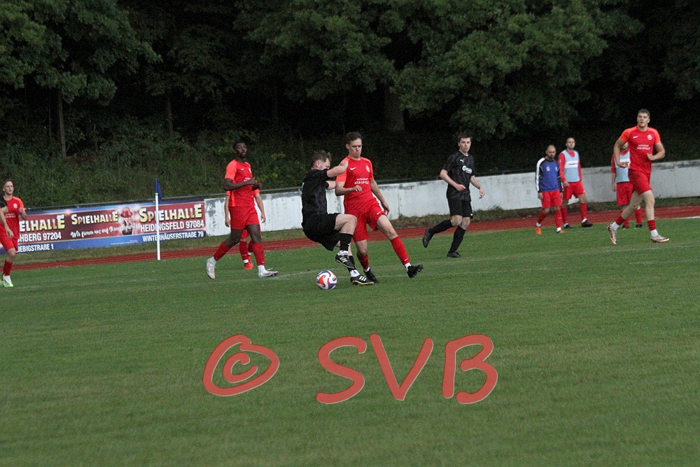 Wie im Vorfeld von Coach Büttner erwatet, sahen die Schaulustigen erst einmal eine Abtastphase der beiden Teams, die sich überhaupt nicht kannten. Die SG agierte aufgrund des Trikotrechtes der „Gäste“, die komplett Rot aufliefen, in komplett schwarzer Montur. Die erste richtig gute Möglichkeit hatte dann der SSV, der wie schon in Runde Eins gegen Höchberg/Waldbüttelbrunn mit einer Fünferkette agierte. Christopher Frieß flankte von Rechts, Marc Weigand misslang der Klärungsversuch und Petrito Quiako kam aus gefährlicher Position zum Abschluss, wurde aber noch geblockt.