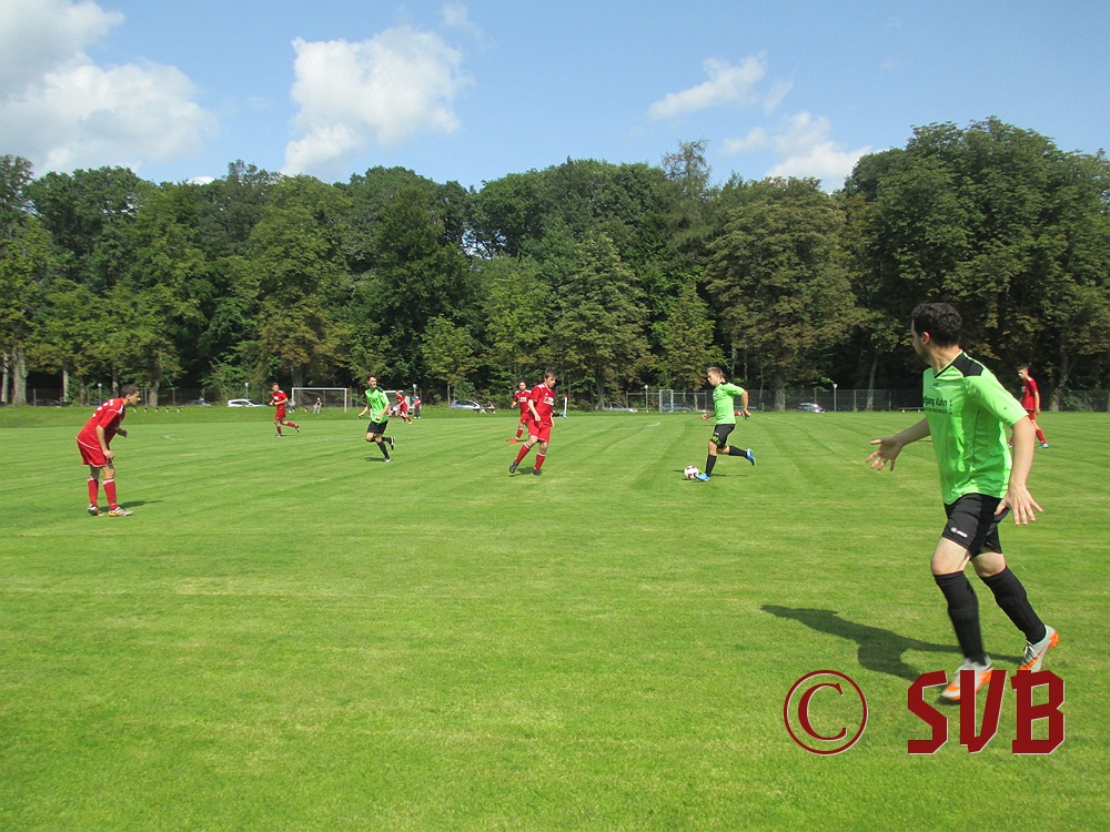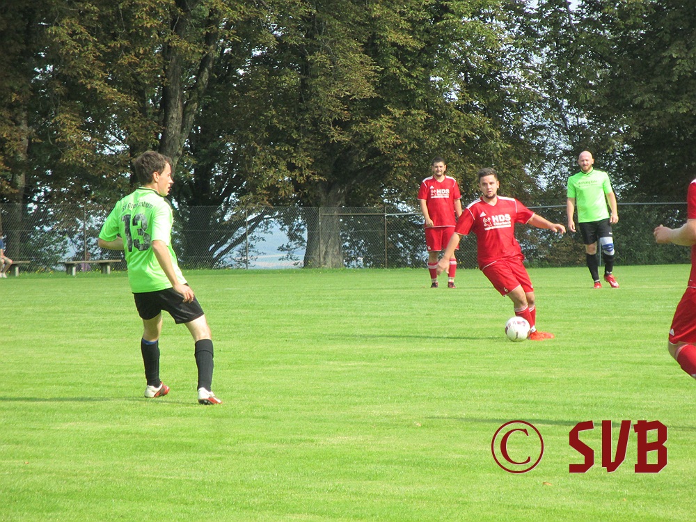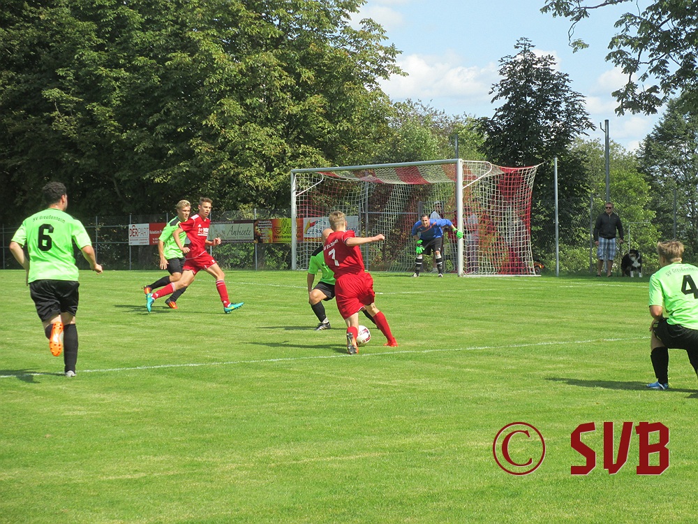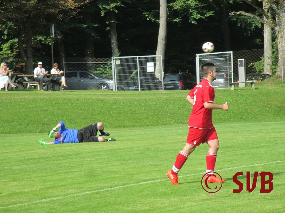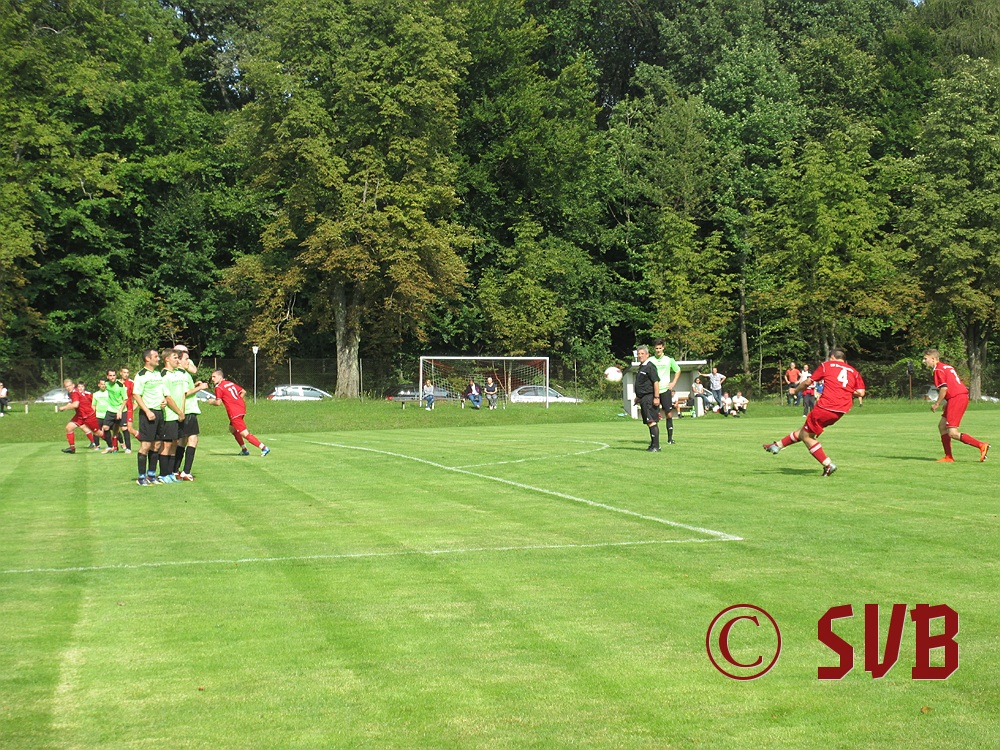 Das Spiel an sich begann der SVB druckvoll – leider nur bis zur fünften Minute, als es Freistoß für den SVB in Rechtsaußen-Position gab. Diesen führte Sebastian Hock schnell aus und fand damit Christian Voss am Elfmeterpunkt. Dessen Direktabnahme parierte Manuel Haberzettl im SVG-Tor klasse.