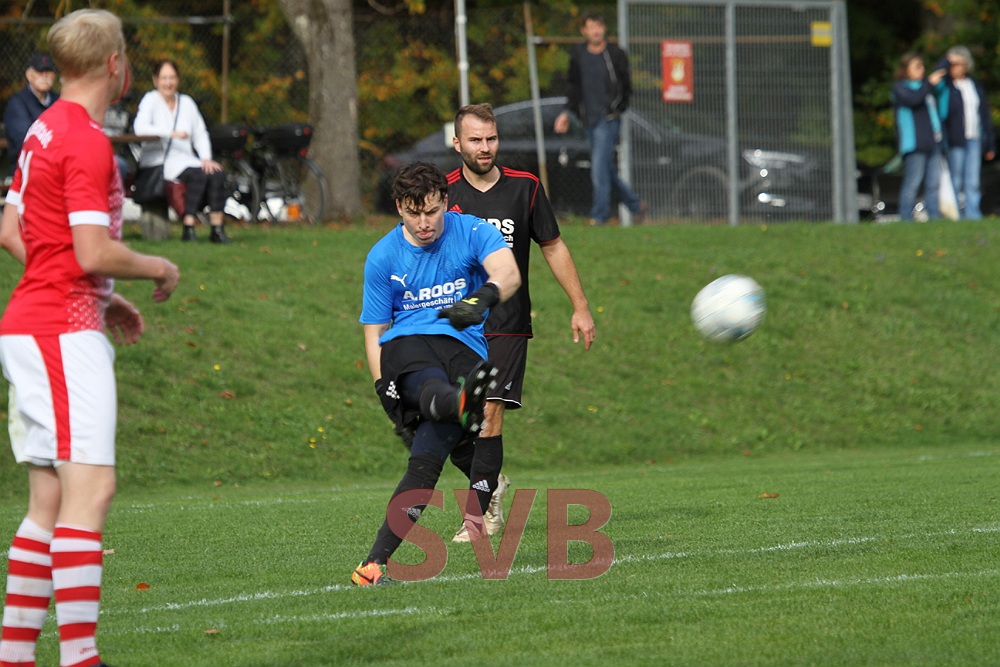 Der SVB erholte sich trotz allem schnell von diesem Schock und spielte weiter nach vorne. Doch weder Luca Ningler nach starkem Einsatz von Jürgen Beeger über rechts, Lars nach starkem Steilpass von Adi, noch Adi nach Querpass von Lars brachten die Pille im Tor unter. Die größte Frechheit des Schiedsrichters folgte in der 29. Minute. Lars legte über rechts astrein in den Rückraum zu Adi quer, dieser zog an seinem Gegenspieler vorbei (war also vorher ganz klar noch hinter ihm) und wurde dann mit einem Abseitspfiff alleine vor dem Torhüter unterbrochen.