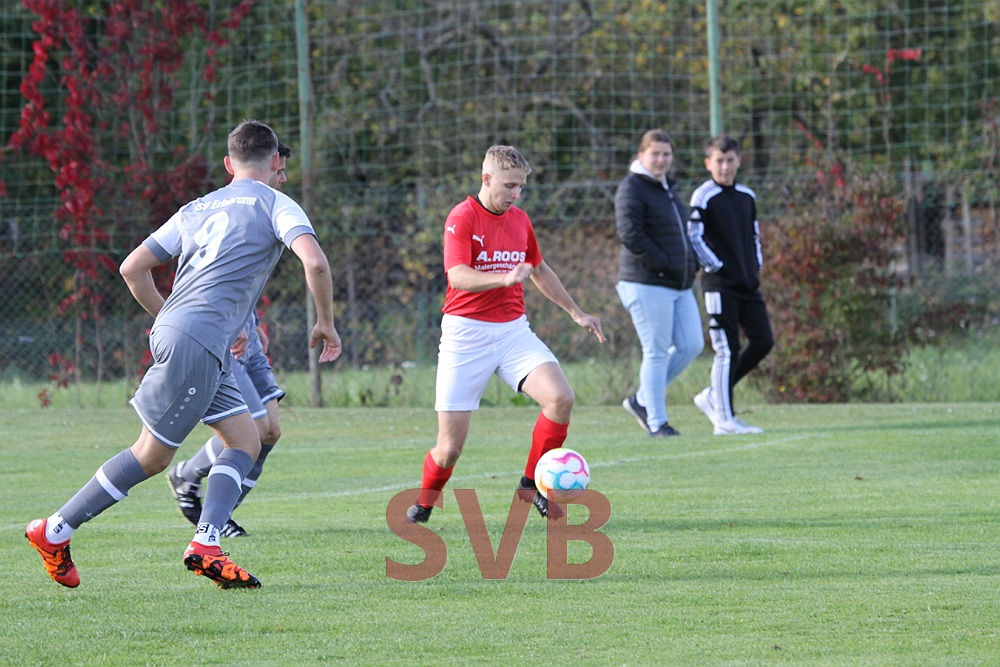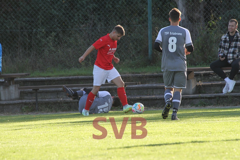 Der TSV fand zunächst wie auch der SVB schwer ins Spiel, verzeichnete aber trotzdem die erste Torchance (11.). Hier traf der agile Spielertrainer und Stürmer Szymon Dynia nach einem Eckball gleich mal die Latte. Bis zur 23. Minute hätten die Erlabrunner schon mehrmals führen können. Aber erst rettete Keeper Christian Heim glänzend gegen Dynia (15.), ehe dieser in der genannten Minute schon an Heim vorbei war, sein Querpass dann aber von der SVB-Abwehr noch gelöscht wurde.