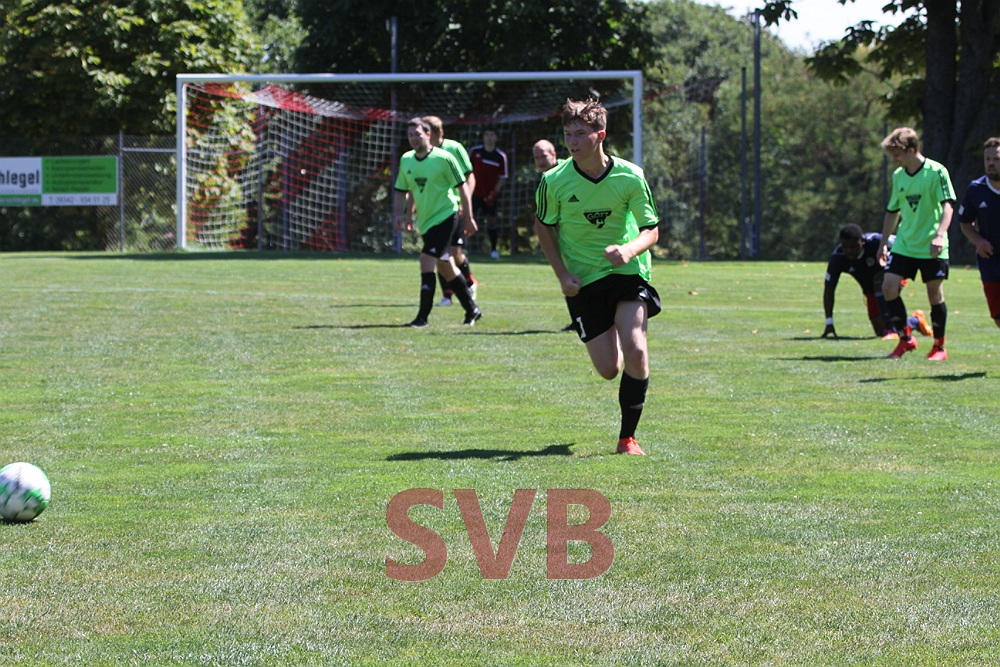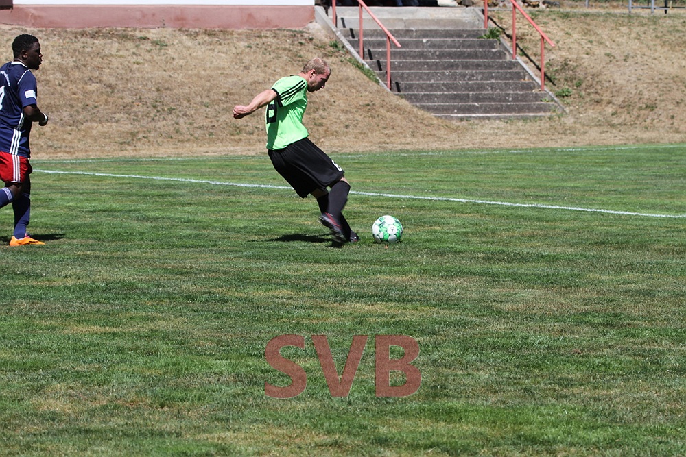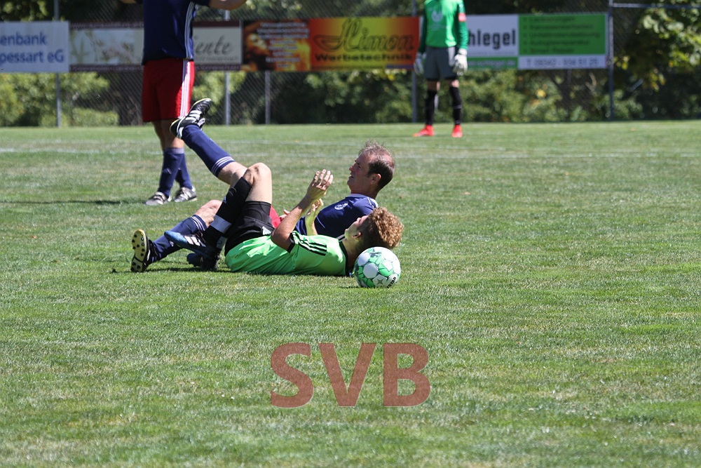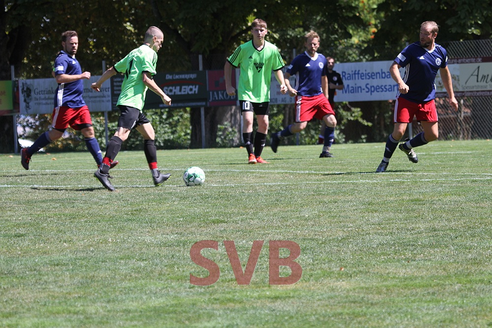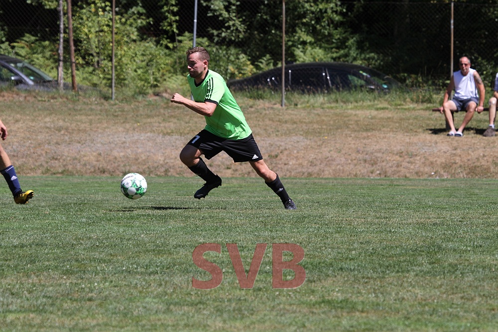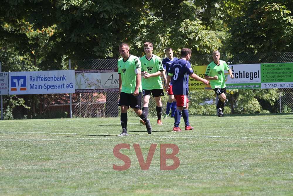 Die im ungewohnten grün spielenden SVBler legten bei heißen Temperaturen auch gleich gut los und verzeichneten eine erste Chance durch Martin Günzelmann, der jedoch zu lange mit dem Abschluss zögerte. Zwei Minuten später war es aber soweit und die Bischbrunner durften jubeln: Nach einem langen Schlag auf Vin Beeger war dieser so gut wie durch, ein Verteidiger grätschte aber noch dazwischen, so dass die Kugel rechts bei Nicolai Albert landete, der direkt auf Michael Väth weiterleitete. Dieser konnte im Zweikampf mit Verteidiger Muritala noch abziehen, so dass die Kugel ins Tor trudelte.