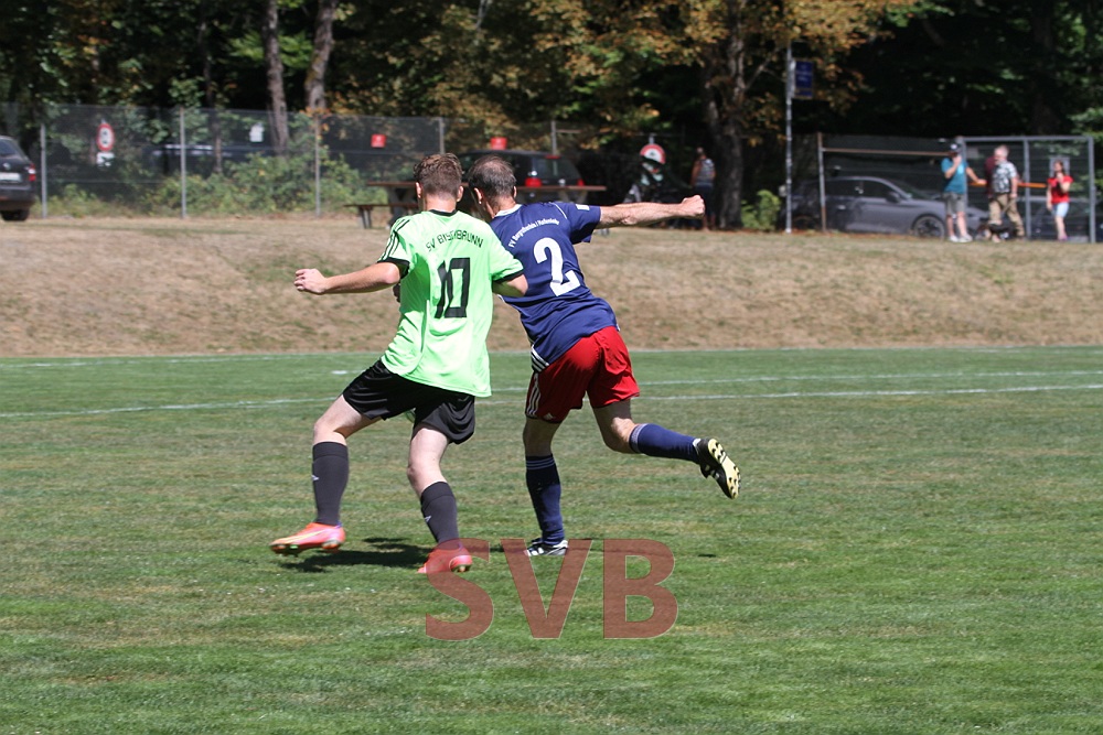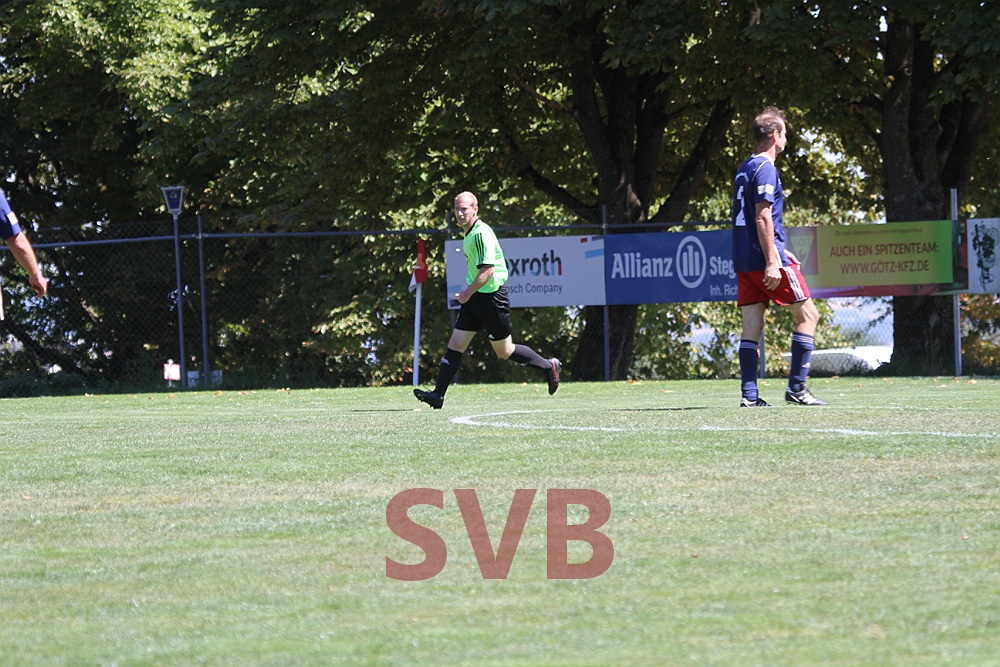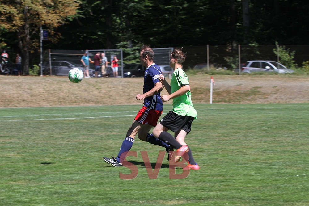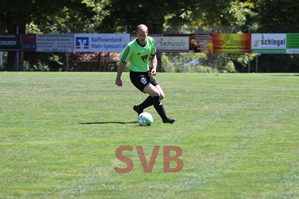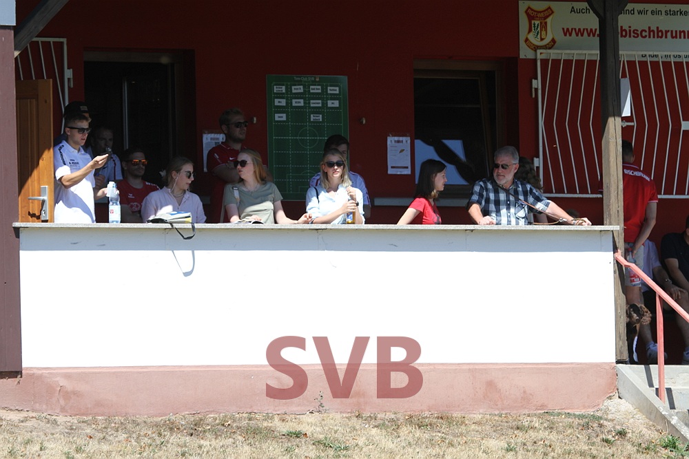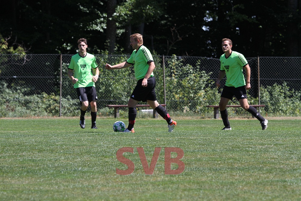 Die im ungewohnten grün spielenden SVBler legten bei heißen Temperaturen auch gleich gut los und verzeichneten eine erste Chance durch Martin Günzelmann, der jedoch zu lange mit dem Abschluss zögerte. Zwei Minuten später war es aber soweit und die Bischbrunner durften jubeln: Nach einem langen Schlag auf Vin Beeger war dieser so gut wie durch, ein Verteidiger grätschte aber noch dazwischen, so dass die Kugel rechts bei Nicolai Albert landete, der direkt auf Michael Väth weiterleitete. Dieser konnte im Zweikampf mit Verteidiger Muritala noch abziehen, so dass die Kugel ins Tor trudelte.