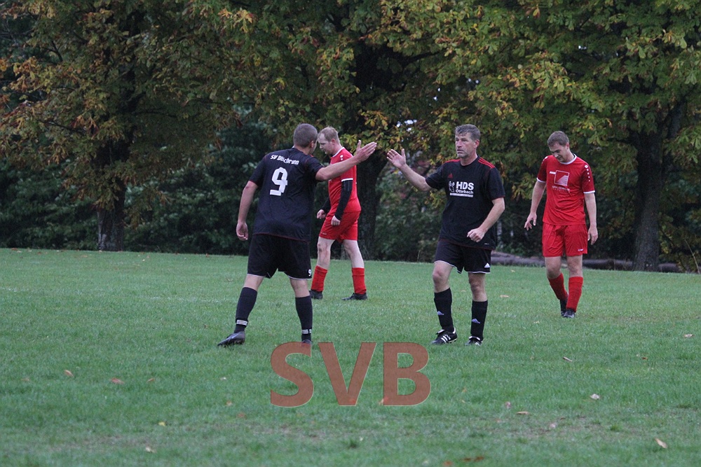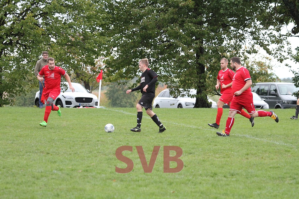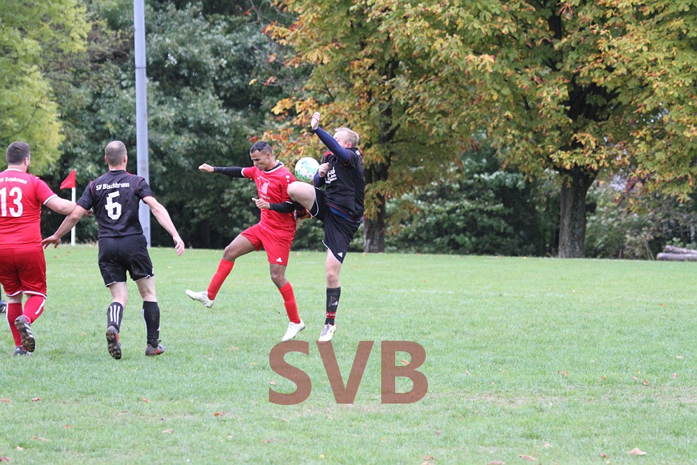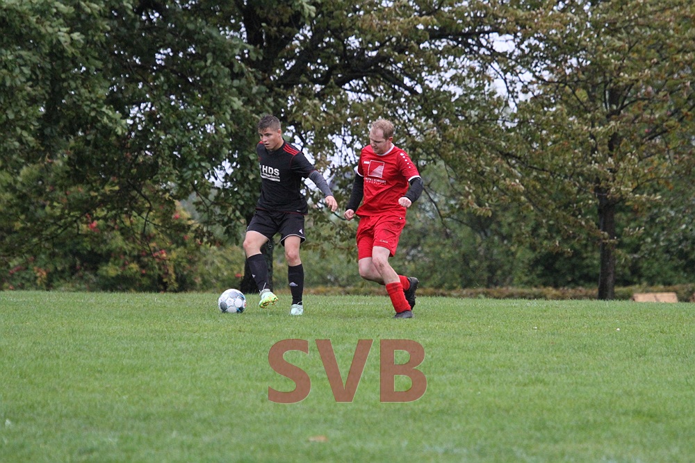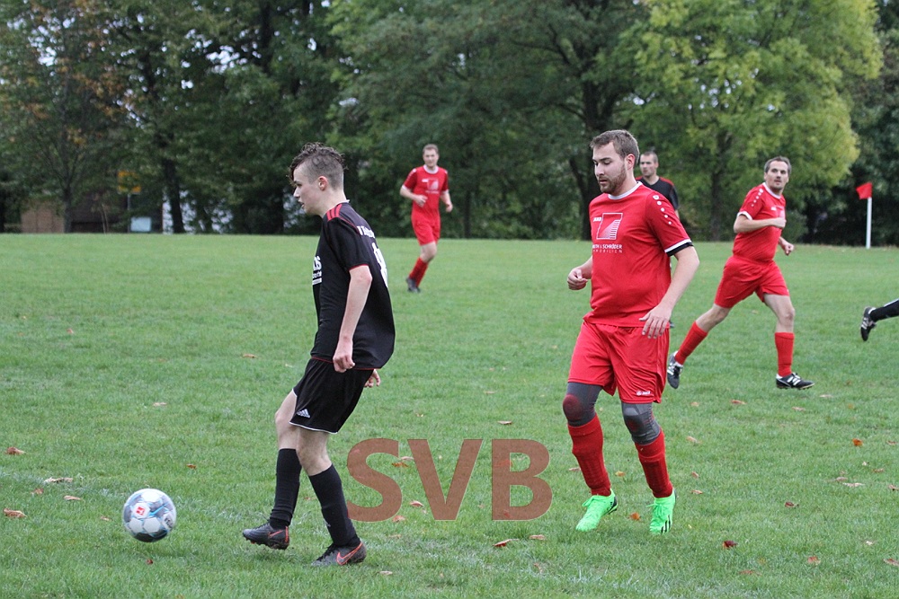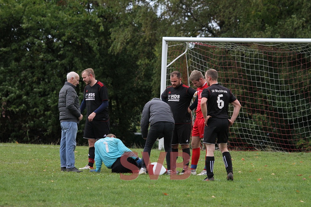 Die Gäste hatten zu Beginn scheinbar Probleme, sich auf dem Bischbrunner Ausweichplatz zurecht zu finden, so dass die in schwarz spielenden SVBler sich mehr und mehr ins Match kämpften und folgerichtig nach 21 Minuten mit 1:0 in Führung gingen. Nach starkem Ballgewinn von Jonas Weidner landete das Spielgerät bei Roland Liebler, der gut zu Michael Väth auf Links durchsteckte. Michl zog dann noch etwas nach innen und vollendete von der 16er-Linie sehenswert unter die Latte.