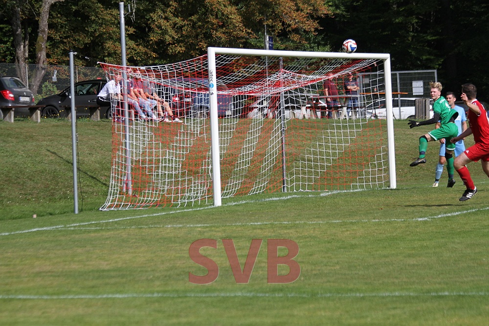 Wenig später beinahe das 0:3, aber die Latte rettete für die SG, wenngleich der Ball vorher bereits im Aus war.