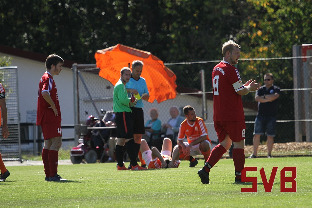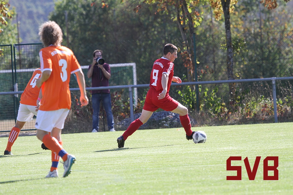 Trotz allem überstand der SVB die ersten 20 Minuten einigermaßen, ehe Keeper Martin Günzelmann etwas übermotiviert aus seinem Kasten stürmte und einen Angriff unterband. Gelbe Karte und Elfmeter waren die korrekte Schlussfolgerung des hervorragend leitenden SR Holger Geis. Sebastian Bieber zielte jedoch zu hoch, so dass der Ball von der Latte zurück ins Feld sprang und auch der Nachschuss wurde vergeben.